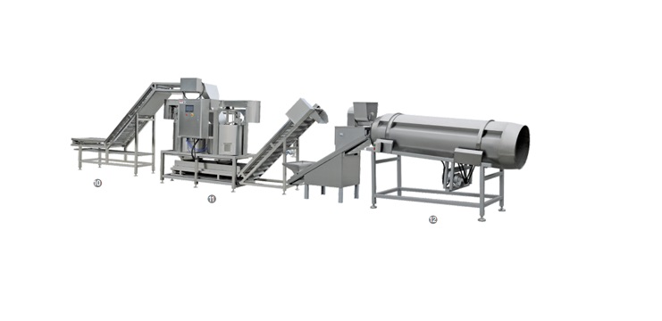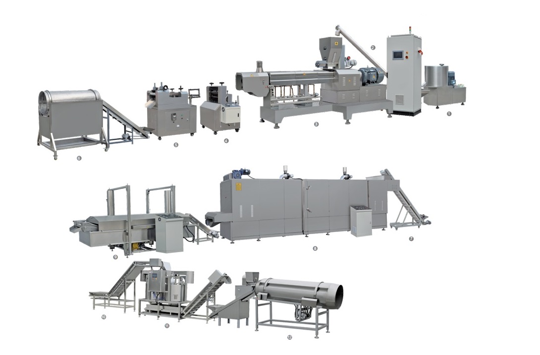 Mixer--extruder--pulling cutter-compound shaper--roller drum--vibration cooler--hoister--dryer--fryer--flavoring