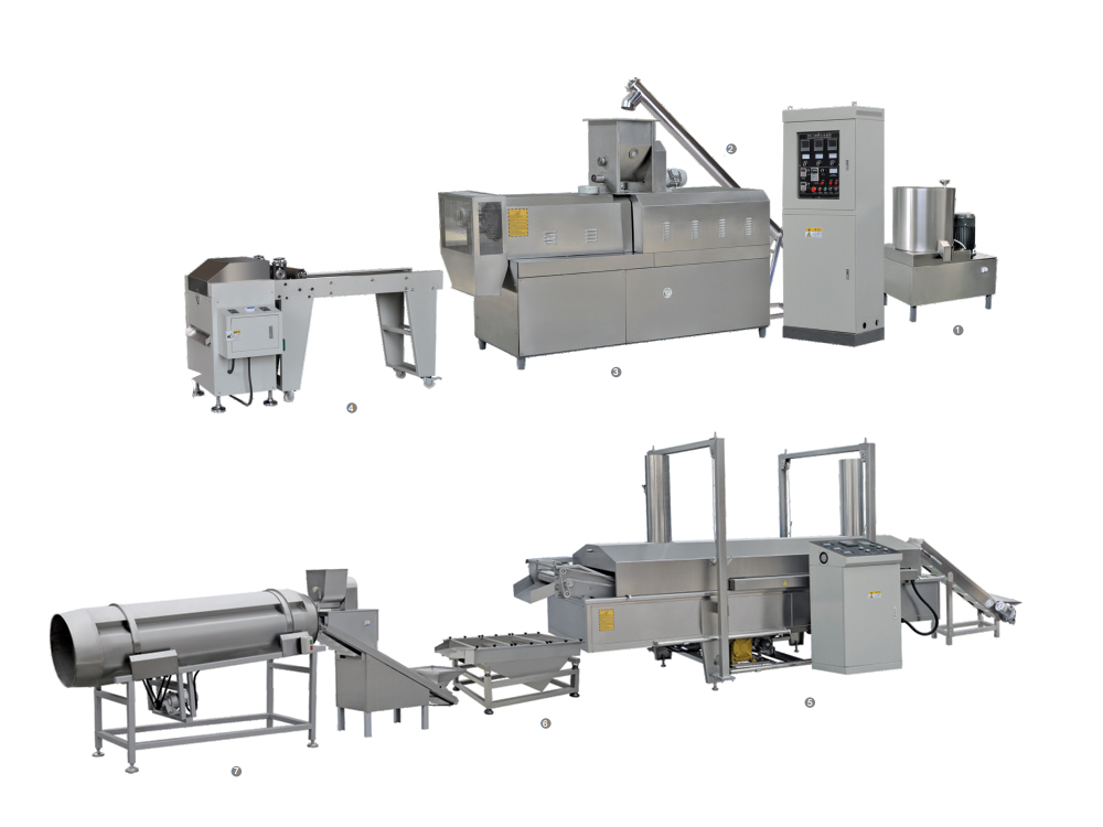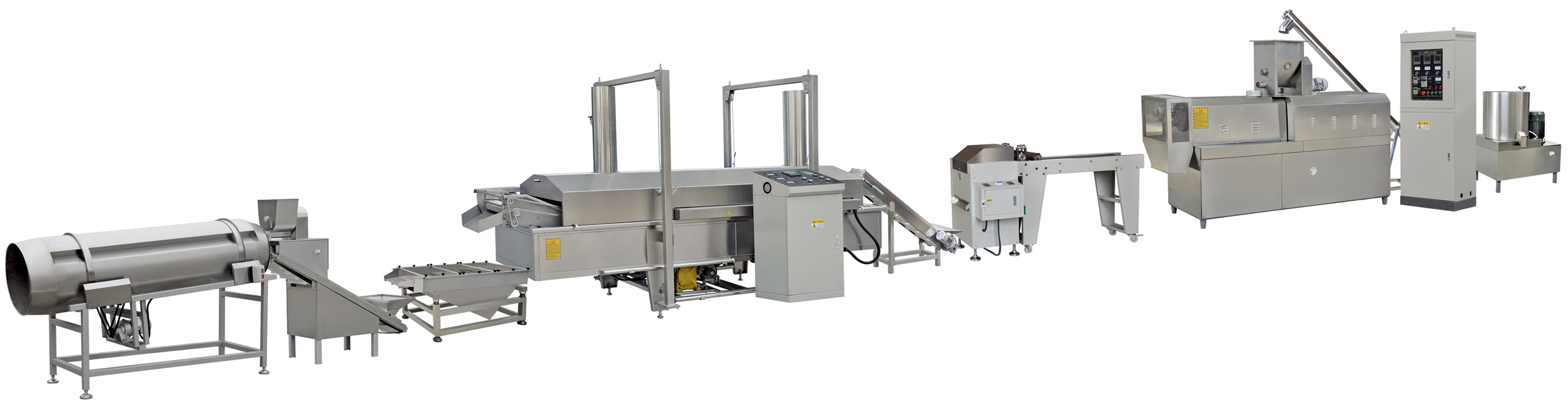 Mixer-- Screw conveyor-- Extruder-- Compound Cutter-- Auto Fryer-- Deoilling Machine -- Flavoring