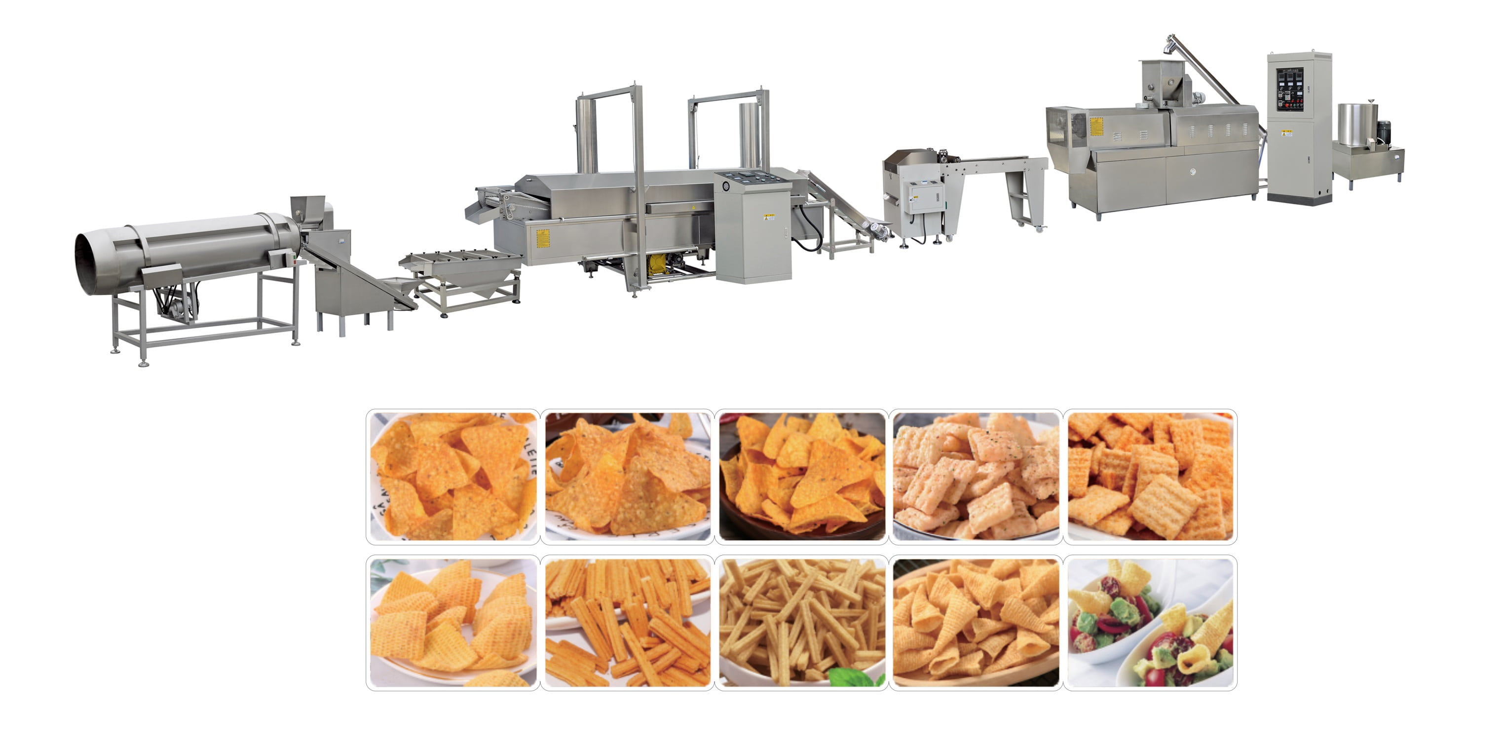 Mixer-- Screw conveyor-- Extruder-- Compound Cutter-- Auto Fryer-- Deoilling Machine -- Flavoring