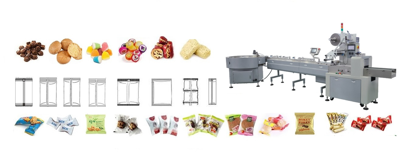 Automatic Rice Cracker Candy Flow Packing Machine adopts bag type: 3-side seal bag, pillow bag.