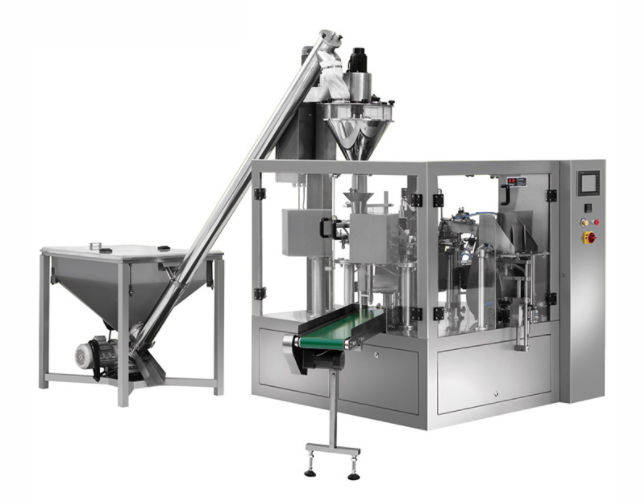 Dry powders, superfoods, snack foods, nuts, and the like are packed via an auger filler or vibratory weigher.